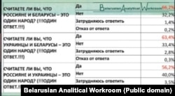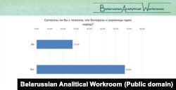 Цікавыя адказы былі дадзеныя ўкраінцамі на пытаньне, ці лічаць яны сябе і беларусаў адным народам. Ладная частка — лічыць, хаця і меншая, чым доля тых, хто захаваў добрае стаўленьне да беларусаў.