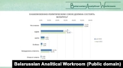 Таксама зьнізілася і доля рэспандэнтаў, якія выступаюць за захаваньне сяброўства Беларусі ў Араганізацыі дамовы аб калектыўнай бясьпецы (АДКБ). Як і ў сакавіцкім апытаньні — адносная большасьць за пазаблёкавы статус Беларусі.