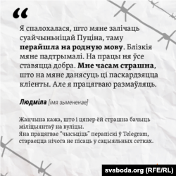 «Я спалохалася, што мяне залічаць суайчыньніцай Пуціна, таму перайшла на родную мову. Блізкія мяне падтрымалі. На працы ня ўсе ставяцца добра. Мне часам страшна, што на мяне данясуць ці паскардзяцца кліенты. Але я працягваю размаўляць. Былі сутычкі невялікія, калі кліенты казалі, што не разумеюць беларускай мовы. Але, паўтаруся, большасьць разумее», — кажа Людміла.