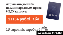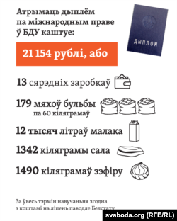 Вывучыцца на мастацтвазнаўцу будзе каштаваць 1364 рублі, або 8,3 сярэдняга заробку. Большасьць спэцыяльнасьцяў каштуюць 12 498 рублёў за ўвесь тэрмін навучаньня ў 4 гады, або 7,6 сярэдняга заробку на сёлетні чэрвень.