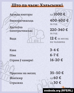 Іншы беларускі айцішнік зь Фінляндыі, Анатоль, расказаў нам, што за кватэру плошчай каля 100 квадратных мэтраў ён аддаваў каля 600 эўра на год (звычайна прынята плаціць раз на год, а не штомесяц), а за дастаўку электрычнасьці — каля 340 эўра.