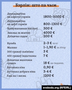 Хлеб, мяса, малако ў Нямеччыне даражэйшыя. Малако каштуе 1–1,90 эўра, кіляграм бульбы — 2–3 эўра, 300 грамаў сьвініны — 3 эўра, 400 грамаў індычыны — 7 эўра. Кубак кавы каштуе ў кавярні 3–5 эўра, прычым якасьць кавы і атмасфэра кавярняў Аксане больш падабаецца ў Беларусі. Бутэльку віна ў Бэрліне можна купіць за 3-4 эўра, піва — за 0,90 эўра.