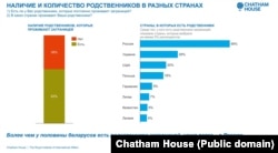 — Большасьць гараджанаў-беларусаў — 62% — маюць сваякоў за мяжой. Найбольш сваякоў у краінах-суседзях — гэта Расея і Ўкраіна. У большасьці тых, хто мае сваякоў за мяжой, гэтыя сваякі жывуць у Расеі — у 69% ад 62%. Гэта значыць, што прыкладна 40% беларусаў маюць сваякоў у Расеі.