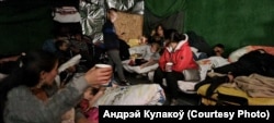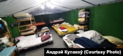 — Калі мы зразумелі, што TESCO бярэ на начлег, мякка кажучы, ня ўсіх, у нас зьявілася ідэя пабудаваць свой намёт на мяжы. Каб людзі маглі паспаць, паесьці. Пабудавалі. Паставілі там ложкі, цяпер нават двухпавярховыя ложкі ў нас ёсьць. На піку ў нас аднае начы спалі 48 чалавек. А звычайна ў сярэднім мы прымаем па 15 чалавек на ноч. Некаторыя сьпяць адну ноч у нашым намёце. Некаторыя жывуць і тыдзень. Вось наш намёт і расейскі шэлтэр на 30 месцаў — тут можна спыніцца. Столькі месцаў — гэта кропля ў моры. Але круцімся як можам.