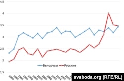 Параўнаньне з графікам 1 паказвае, што стаўленьне да беларусаў істотна пагоршылася ў параўнаньні зь велізарным пэрыядам назіраньняў за амаль чвэрць стагодзьдзя.