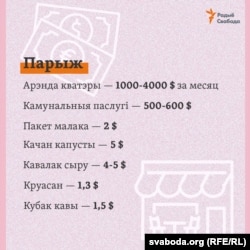 Цэны ў парыскіх гіпэрмаркетах можна параўнаць зь беларускімі, кажа суразмоўца. Праўда, у цэнтры сталіцы ўсё даражэйшае. Пакет малака каштуе 2 эўра, качан капусты — 5 эўра, кавалак сыру — 4-5 эўра, круасан — 1,3 эўра, кубак кавы — 1,5 эўра.