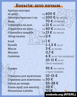 «Канцы з канцамі сям’я з чатырох чалавек у краіне можна зьвесьці за 1800–2000 эўра ў месяц, і гэта будзе нагадваць беларускі варыянт выдаткаў — выжыць любой цаной. У каго даход вышэйшы, той ужо можа дазволіць сабе паходы па пабах, адпачынкі, паездкі, моднае адзеньне, тэлефоны і аўто».