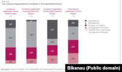Геапалітычныя прыярытэты выяўляюцца ў адказах на пытаньне аб падтрымцы аднаго з бакоў у расейска-украінскай вайне: 41% адмаўляецца займаць які б то ні было бок, 39% выказваюць падтрымку Расеі і 20% — Украіне. Прарасейскую пазыцыю займае большасьць прыхільнікаў цяперашняй улады ў Беларусі (77%) і аўдыторыі дзяржаўных мэдыя (60%). Сярод праціўнікаў улады Ўкраіну падтрымліваюць 66%, а сярод аўдыторыі недзяржаўных мэдыя — 44%. Словам, сэгмэнты з прарасейскім патэнцыялам кансалідавана выступаюць у падтрымку Расеі, тады як патэнцыйна праўкраінскія сэгмэнты часьцей сыходзяць у нэўтралітэт.