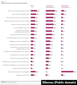 Пад інтэграцыяй з РФ беларусы рэдка маюць на ўвазе зьліцьцё асноўных дзяржаўных інстытутаў. Як прыхільнікі, так і праціўнікі інтэграцыі часьцей лічаць, што яна павінна азначаць супрацоўніцтва ў навукова-тэхнічнай сфэры і стварэньне агульнай візавай прасторы.