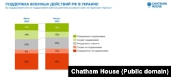 І гэта дакладна тое ж, што мы назіраем у апытаньнях Chatham House, БАМ і Біканава. Наяўнасьць у пытаньні альтэрнатывы ў выглядзе пазыцыі Ўкраіны падвышае колькасьць тых, хто выказвае падтрымку Расеі ў вайне.