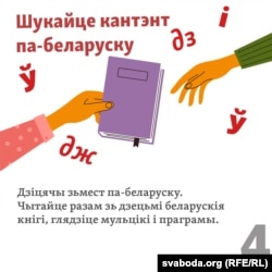 «Калі мы гадавалі сына, быў толькі канал „Умачка“ (расейскамоўны канал на YouTube для дзяцей. — РС). Былі кніжкі, карткі, якія я сама зрабіла, нейкія магніты, календары, любы друкаваны кантэнт па-беларуску. Нават калі дзіця яшчэ не пачало гаварыць, усё адно размаўляйце з ім па-беларуску. Можна прасіць не размаўляць з дзіцём па-расейску, але гэта залежыць ад вашых стасункаў са сваякамі, у нас не заўсёды атрымлівалася».