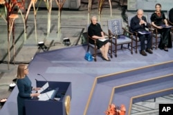 Натальля Пінчук, жонка Алеся Бяляцкага, чытае ягоную Нобэлеўскую лекцыю. Осла, 10 сьнежня 2022