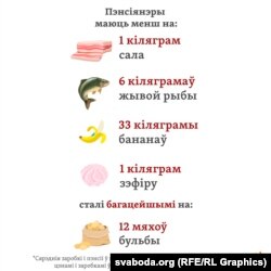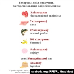 Беларус, які працуе, зьбяднеў за год на 7 кг сала і пабагацеў на 12 кг бульбы. Як інфляцыя зьядае заробкі