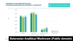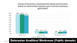 — Ключавым сярод «ваенных» індыкатараў зьяўляюцца адказы на пытаньне «Як вы ставіцеся да магчымага ўводу беларускіх войскаў на тэрыторыю Ўкраіны для ўдзелу ў ваенных дзеяньнях?». І ў адказах на гэтае пытаньне двух інфармацыйных коканаў няма. Тут ёсьць дакладная кансалідацыя — больш за 80% даюць адмоўны адказ.