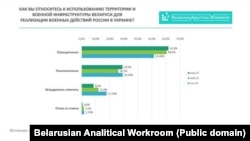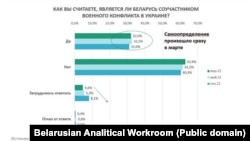 Што да пытаньня, ці ўдзельнічае Беларусь у ваенным канфлікце, то пераважная большасьць беларусаў дае адмоўны адказ. І гэта люстэркава кантрастуе з адказамі падчас апытаньняў ва Ўкраіне, дзе больш за 80% лічаць, што Беларусь — саўдзельніца агрэсіі.