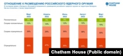 — Апошняе апытаньне Chatham House праводзіў сярод беларусаў-гараджанаў з 15 па 27 сакавіка. Якраз 25 сакавіка Ўладзімір Пуцін абвясьціў, што Расея разьмесьціць у Беларусі тактычную ядзерную зброю. Частка апытаньня праводзілася да гэтай заявы, частка — пасьля. Вы задавалі гэтае пытаньне на працягу апошняга году. Якія зьмены ў грамадзкіх настроях можна адзначыць? Здаецца, ёсьць невялікі скачок на карысьць разьмяшчэньня ядзернай зброі?