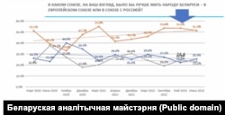 — Паводле апытаньняў БАМ, у адказах на пытаньне пра выбар паміж саюзам з РФ і ўступленьнем Беларусі ў ЭЗ доля прыхільнікаў саюзу з Расеяй крыху павялічылася — з 46% у сакавіку 2022 да 51–53% у наступныя хвалі апытаньняў. Доля прыхільнікаў эўраінтэграцыі за гэты ж час зьнізілася з прыкладна 30% да 22–25%. У чым прычыны гэтага заўважнага, хоць і параўнальна невялікага зруху?