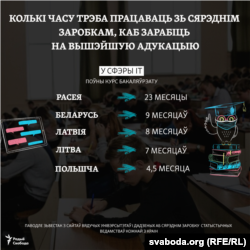 Калі вымяраць кошт навучаньня ў сярэдніх заробках, то сярод усіх эўрапейскіх суседзяў у Беларусі на поўны курс вучобы на ІТ-спэцыяліста спатрэбіцца 9 месяцаў працы. У Латвіі — 8 месяцаў, у Літве — 7 месяцаў, у Польшчы — 4,5 месяца.