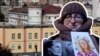Былая палітзьняволеная Валерыя Чарнаморцава глядзіць на свой партрэт, намаляваны мастачкай Ксішай Анёлавай