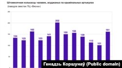 — Узважыць значнасьць гэтых паказьнікаў даволі складана. Складана яшчэ і таму, што гэта ня проста сухія лічбы — гэта лёсы людзей. Калі гаварыць пра дынаміку, то яна ў розных паказьнікаў розная. Дадзеныя за першы квартал 2024 году яшчэ не апрацаваныя. Але ў 2023 годзе колькасьць адміністрацыйных справаў расла ад квартала да квартала. А колькасьць крымінальных справаў — хутчэй зьніжалася. Тое самае мы можам сказаць і пра колькасьць палітвязьняў: цягам мінулага году яна паступова зьніжалася.