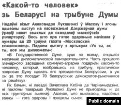 20 траўня 1994 году «Свабода» перадрукоўвае нататку з «Московского комсомольца» пад назвай «„Какой-то человек“ на трыбуне Дзярждумы»: «У Дзяржаўнай Думе, мяркуючы па ўсім, адкрыўся месячнік дыпляматычнай самадзейнасьці. Частку мінулага пленарнага паседжаньня камуна-аграрыі падарылі нейкаму чалавеку, які, забраўшыся на трыбуну, практычна папрасіў Думу зрабіць яго прэзыдэнтам Беларусі, а ўжо ён за гэта пасадзіць 70 беларускіх дэмакратаў-рыначнікаў за краты».