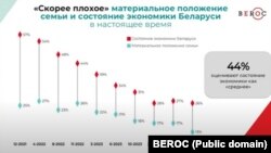 Зьменшылася доля тых, хто ацэньвае як «хутчэй кепскае» становішча сваёй сям’і і эканомікі краіны ў цэлым. З канца 2021 году абедзьве долі скараціліся прыкладна ўдвая.