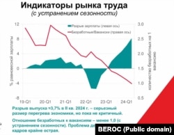 З графіку бачна, што напрыканцы першага кварталу 2024 году сярэдні заробак перавышаў раўнаважны на 8%. Пры гэтым з пачатку году колькасьць вакансіяў перавысіла колькасьць беспрацоўных. «Праблема дэфіцыту кадраў надзвычай вострая», — канстатуюць экспэрты BEROC.