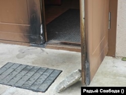 Побач зь дзьвярыма бачныя рэшткі пабітай бутэлькі са сьлядамі падпалу, меркавана гэта «кактэйль Молатава». Паводле раскладу, пасьля 10 гадзіны раніцы там меліся адбыцца заняткі для дзяцей.