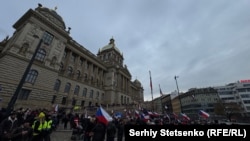 Некалькі соцень чалавек выйшлі да сьценаў музэю з плякатамі «Вайна — гэта сьмерць, мір — гэта жыцьцё» і «Чэхія — на першым месцы».