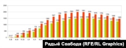 Варта адзначыць, што, нягледзячы на адрозьненьні ў абсалютных лічбах, дынаміка ў абодвух шэрагах практычна ідэнтычная: рэзкі рост з другога кварталу 2020-га па другі квартал 2021-га; яшчэ больш імклівы рост з трэцяга кварталу 2021 году да чацьвёртага кварталу 2022 году; з другога кварталу 2023 году да канца мінулага году — манатоннае зьніжэньне, якое крыху паскорылася з другога кварталу 2024 году.