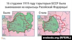16 студзеня 1919 году, праз два тыдні пасьля абвяшчэньня БССР, тэрыторыю савецкай Беларусі зьменшылі на карысьць Расейскай Фэдэрацыі. Да РСФСР адышлі Віцебская, Магілёўская і Смаленская губэрні. Больш падрабязна чытайце пра гэта ў нашым праекце «Як малявалі межы Беларусі».