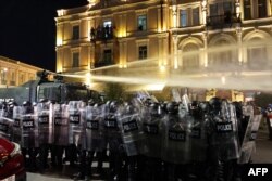 Спэцназ выкарыстаў пярцовы спрэй, сьлёзацечны газ і вадамёт для абароны палаца.