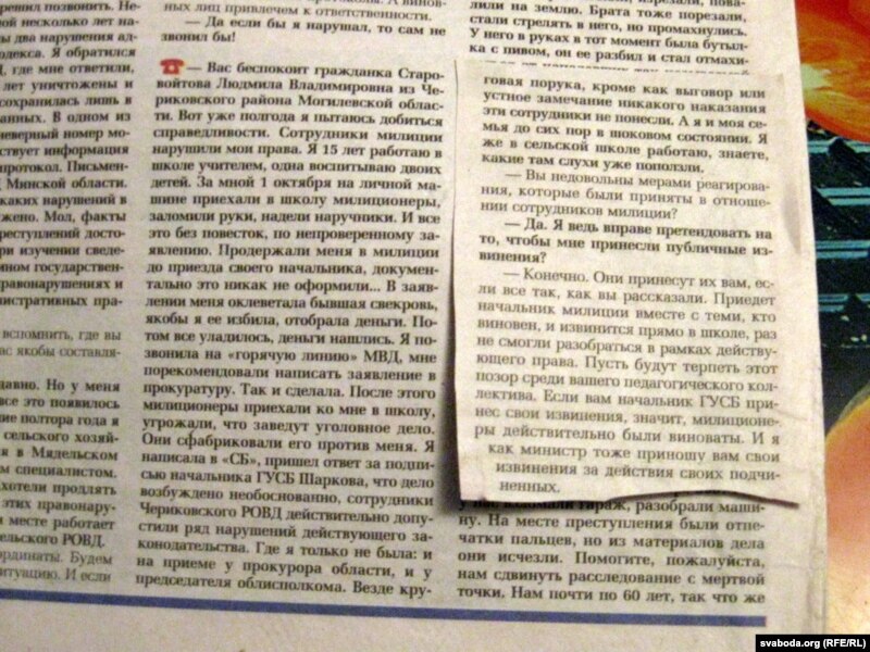 «І калі я ня стала даваць паказаньні, сказалі: „Можаш быць вольнай“. Кажу, не, панове, я столькі часу праседзела, і ў мяне няма грошай — буду чакаць начальніка. У 9 вечара паклікалі — „грошы знайшліся, але прызнайцеся, што вы палкай зьбілі двух чалавек“. Я кажу — вы хочаце, каб я сябе абгаварыла?! Далей патэлефанавала на „гарачую лінію“ ў МУС, напісала ў пракуратуру, копію заявы занесла старшыні райвыканкаму Кадаценку. Потым сакратарка мне прызналася, што была накладзена яго віза — „заяўніку адказу не даваць“. У той жа дзень да мяне зьявіліся два замы начальніка Чэрыкаўскай міліцыі — Сяргееў і Післар. Яны пагражалі, што ўзбудзяць супраць мяне крымінальную справу, калі заяву не забяру. Я сказала — узбуджайце! І справа была ўзбуджана. Яны скардзіліся ва ўпраўленьне ўнутраных спраў Магілёўскага аблвыканкаму за тое, што я патрабавала весьці справу на беларускай мове…»