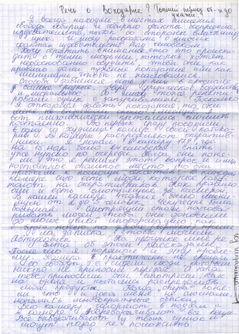 "У маёй камэры сядзеў чалавек, якому людзі ў масках выбілі зубы. Гэтыя выбітыя зубы ён прынёс у камэру ў руках. Яго спрабавалі прымусіць не пісаць скаргаў. Чалавек супраціўляўся, і яго штучна "прышылі" да гучнай справы гомельскага аўтарытэта па мянушцы "Салдат". Карпусны, забіраючы гэтага чалавека з камэры, надзеў яму кайданкі, чаго звычайна не практыкуюць.