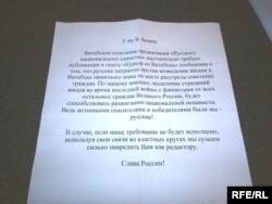 Ананімныя аўтары ад імя Віцебскай філіі незарэгістраванай арганізацыі "Русское Национальное Единство" патрабуюць зьмясьціць у газэце артыкул пра недапушчальнасьць будаўніцтва мэмарыяльнага знака мясцовым ахвярам Галакосту. У адваротным выпадку яны пагражаюць перашкодзіць выхаду газэты і пакараць рэдактара й распаўсюдніка.