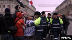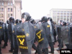 На плошчы Незалежнасьці некалькі соцень спэцназаўцаў і салдат унутраных войскаў у бронекамізэльках, грукаючы па шчытах дубінкамі, пайшлі на дэманстрантаў з боку пэдагагічнага ўнівэрсытэту.