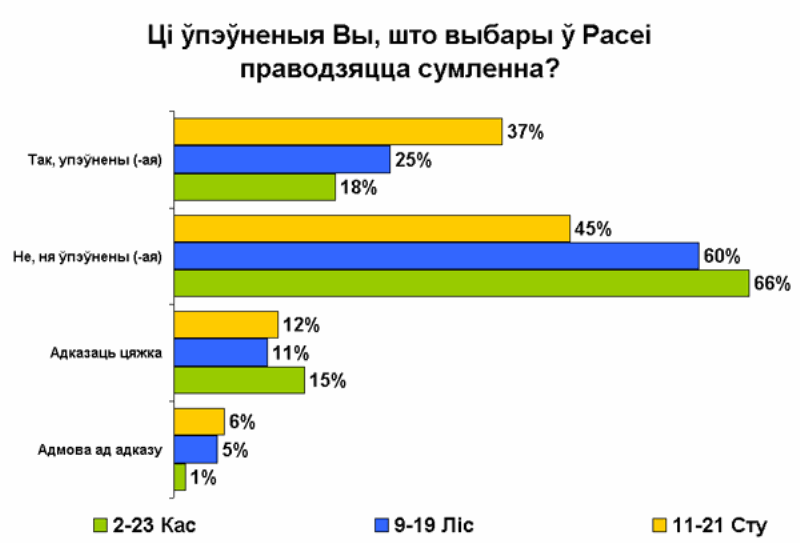 Вынікі выглядаюць парадаксальна: 45% апытаных выказваюць сумневы ў тым, што выбары пройдуць сумленна, 65% мяркуюць, што адказ на пытаньне, хто будзе наступным прэзыдэнтам, залежыць ад Уладзімера Пуціна і ягонай адміністрацыі, і толькі 19% мяркуюць, што гэта будзе залежаць ад волі выбаршчыкаў. І разам з тым тры чвэрці апытаных кажуць, што пойдуць галасаваць, пры гэтым 45% апытаных чакаюць ад прэзыдэнцкіх выбараў лепшага жыцьця для сябе і сваёй сям’і і прыкладна столькі ж – падвышэньня пэнсіяў і заробкаў.