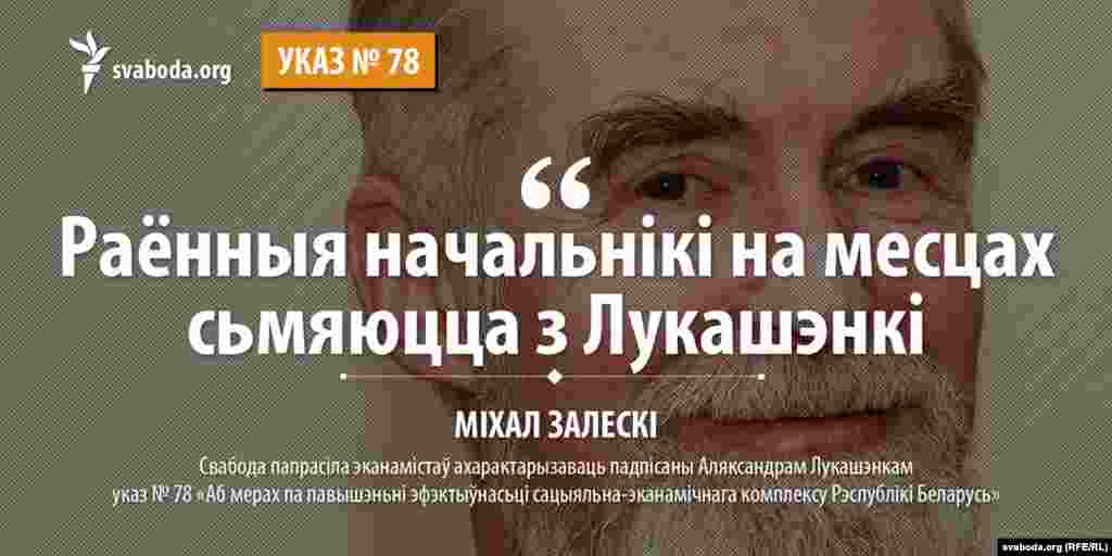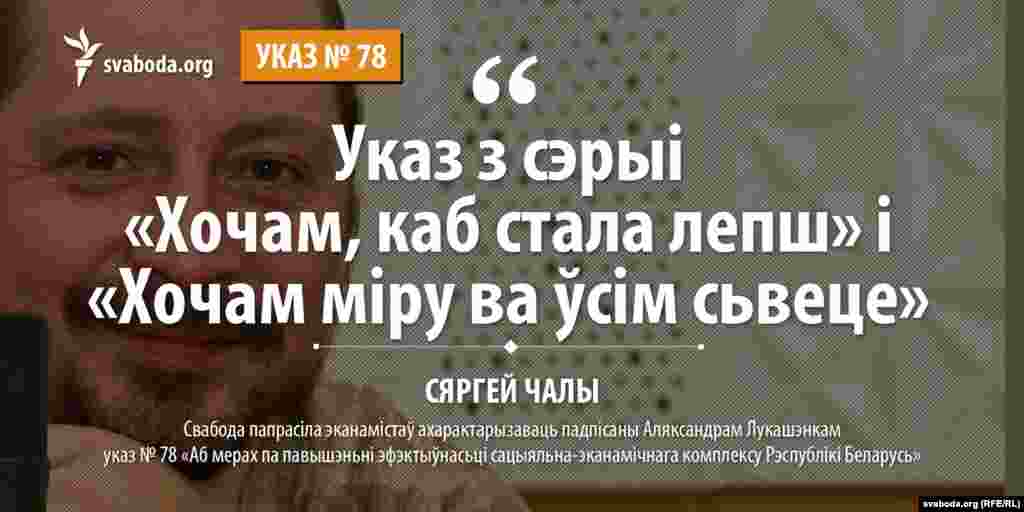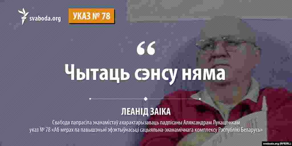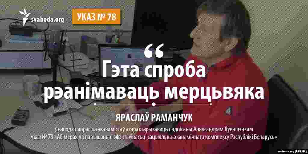 Эканамічныя экспэрты не шкадавалі словаў, каб ахарактарызаваць для Радыё Свабода падпісаны Аляксандрам Лукашэнкам указ № 78 «Аб мерах па павышэньні эфэктыўнасьці сацыяльна-эканамічнага комплексу Рэспублікі Беларусь». Указ, які мае на мэце забясьпечыць «эканамічную бясьпеку» і «сацыяльную стабільнасьць», абавязвае, сярод іншага, зьнізіць сабекошт прадукцыі на дзяржпрадпрыемствах ня менш як на 25%, нарасьціць і дывэрсыфікаваць экспарт, забясьпечыць «рацыянальнае імпартазамяшчэньне», нарасьціць золатавалютныя рэзэрвы «да эканамічна бясьпечнага ўзроўню» і г.д.