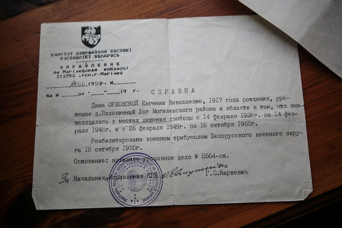 «Напачатку, як я была маладая, дык многія казалі пра мяне: „Жэня вораг народу. У турме сядзела“, — выціраючы сьлёзы, кажа Яўгенія Мікалаеўна. — А як прынесьлі мне дакумэнты пра рэабілітацыю, дык мяне ўзвысілі. І тады ўсе зласьліўцы змоўклі. Я тады ўзьнеслася вышэй за неба ад радасьці. Ніхто слова супраць мяне не казаў. Славілі мяне. Толькі я ня ведала, за што сядзела».