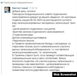 У звароце гаворыцца пра паведамленьне, якое нібы распаўсюджваў у сацсетцы намесьнік старшыні рады Віктар Серы, і прыводзіцца скрыншот. У тым паведамленьні «Братэрства арганізатараў студэнцкага самакіраваньня», «Цэнтар разьвіцьця студэнцкіх ініцыятываў» і «Студэнцкая рада» называліся «несанкцыянаванымі» і «незаконнымі», адрасатаў прасілі правесьці прафіляктычныя гутаркі са старастамі групаў і празь іх давесьці да студэнтаў, што дзейнасьць згаданых арганізацыяў — гэта «мэтанакіраванае ўвядзеньне ў зман з элемэнтамі антыдзяржаўнага характару».