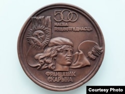 Раней ён вырабіў узоры гліняных і мэталічных мэдальёнаў з сэрыі «Наша пяцісотгоднасьць», дзе Скарына названы так, «як і мае быць» — Францішкам. На авэрсе — рысы твару першадрукара і юбілейная лічба 500.
