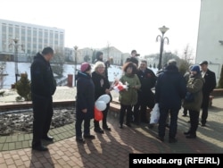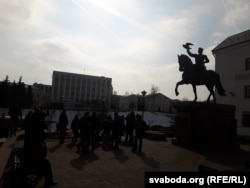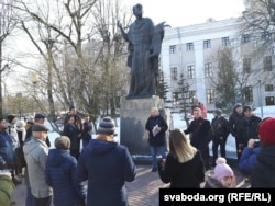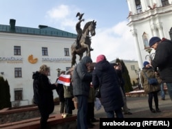 У Віцебску каля помніка Альгерду сабралася пару дзесяткаў жыхароў — з кветкамі, са сьцягам, віншуюць адно аднаго.​