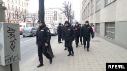 Чуваць, як міліцыянты перадаюць адзін аднаму, што людзей у масках пасьля завяршэньня акцыі будуць затрымліваць.