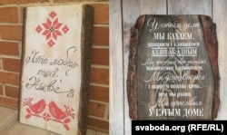 А гэтыя драўляныя пано робіць Ганна Уладава, па мянушцы мама Карла. На драўляных сьпілах выпісвае яна галоўныя словы і вобразы, якія будуць прыцягваць позіркі да сьцяны ці іншага месца, дзе б іх вы ні павесілі. У яе асартымэнце маюцца і зэдлікі ў стылі лофт, і драўляныя цацкі, якімі можна аздобіць інтэрʼер. А вось гэтыя пано з дрэва каштуюць 50 рублёў.