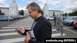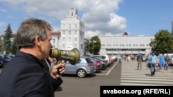 Ён прыйшоў сюды з аднапартыйцамі, якія раздавалі праграмныя дакумэнты АГП, газэту «Народная Воля» і праграму «Мільён працоўных месцаў», якая мае стаць часткай перадвыбарчай праграмы Анатоля Лябедзькі. Палітык таксама заклікаў падтрымаць ягоную кандыдатуру на ўдзел у прэзыдэнцкіх выбарах.