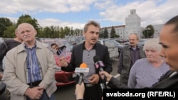 Лідэр Аб’яднанай грамадзянскай партыі Анатоль Лябедзька прэзэнтаваў праграму «Мільён працоўных месцаў» каля прахадной Менскага трактарнага заводу.