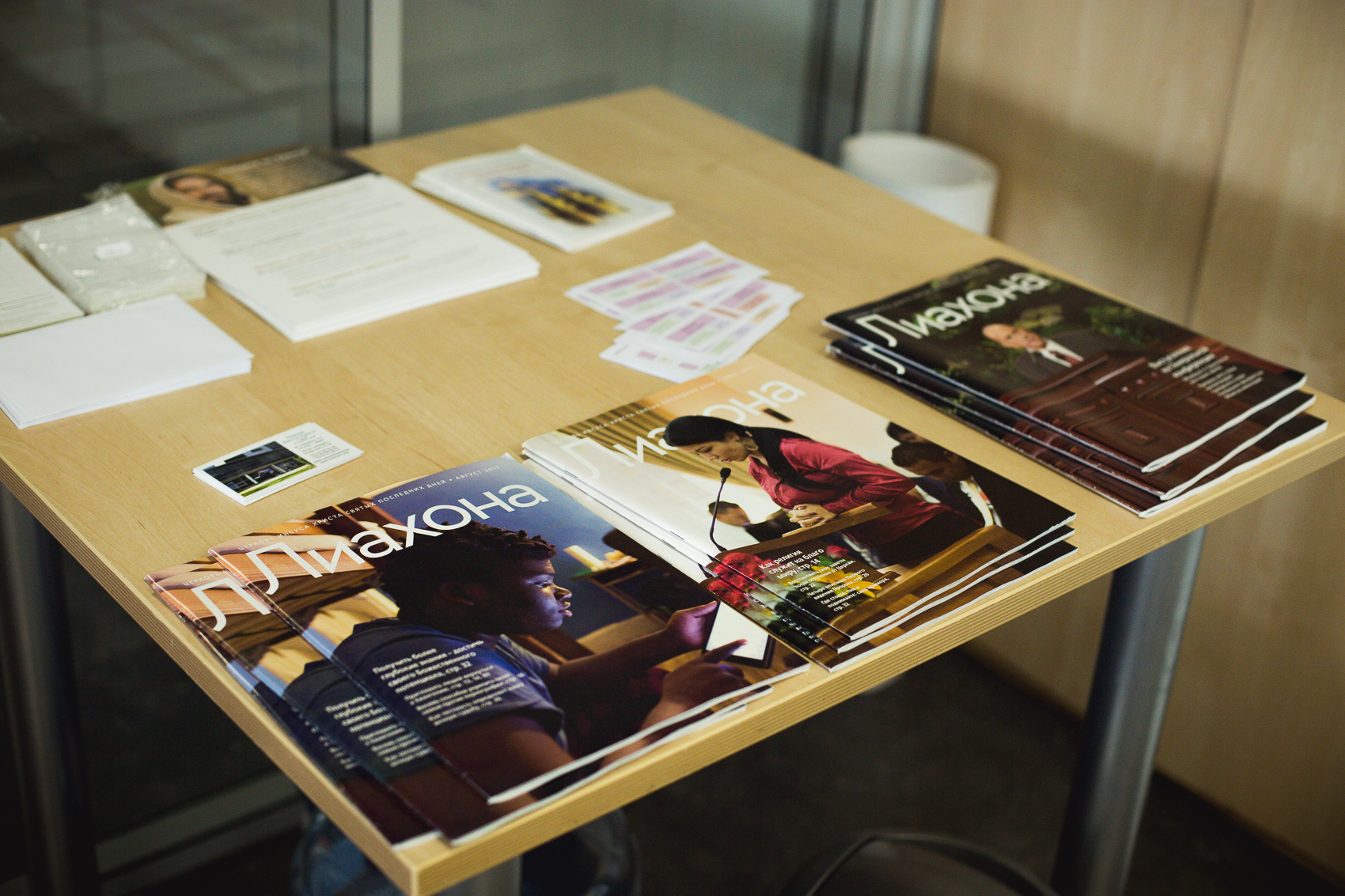 Каля ўваходу на невялічкім століку ляжаць штомесячныя часопісы «Ліяхона» і кніжкі «Ў імя маральнай сілы моладзі» на 40 старонак — яны адрасаваная моладзі ды зьмяшчаюць жыцьцёвыя парады.