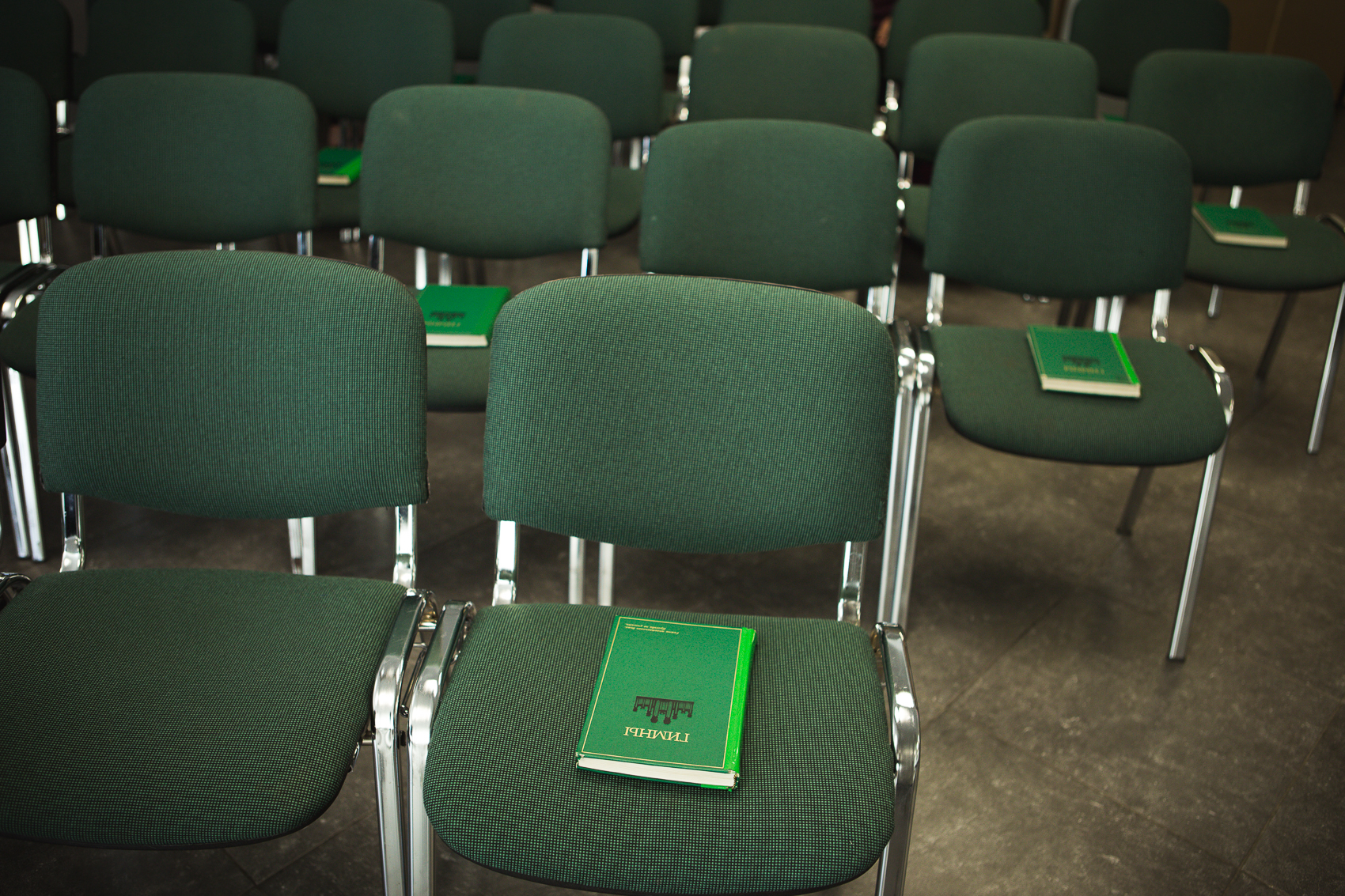 Заходзім у залю. Да пачатку хвілін пятнаццаць. На вольных месцах ляжаць зялёныя сьпеўнікі. Перад сабранымі чатыры лічбы — нумары гімнаў.