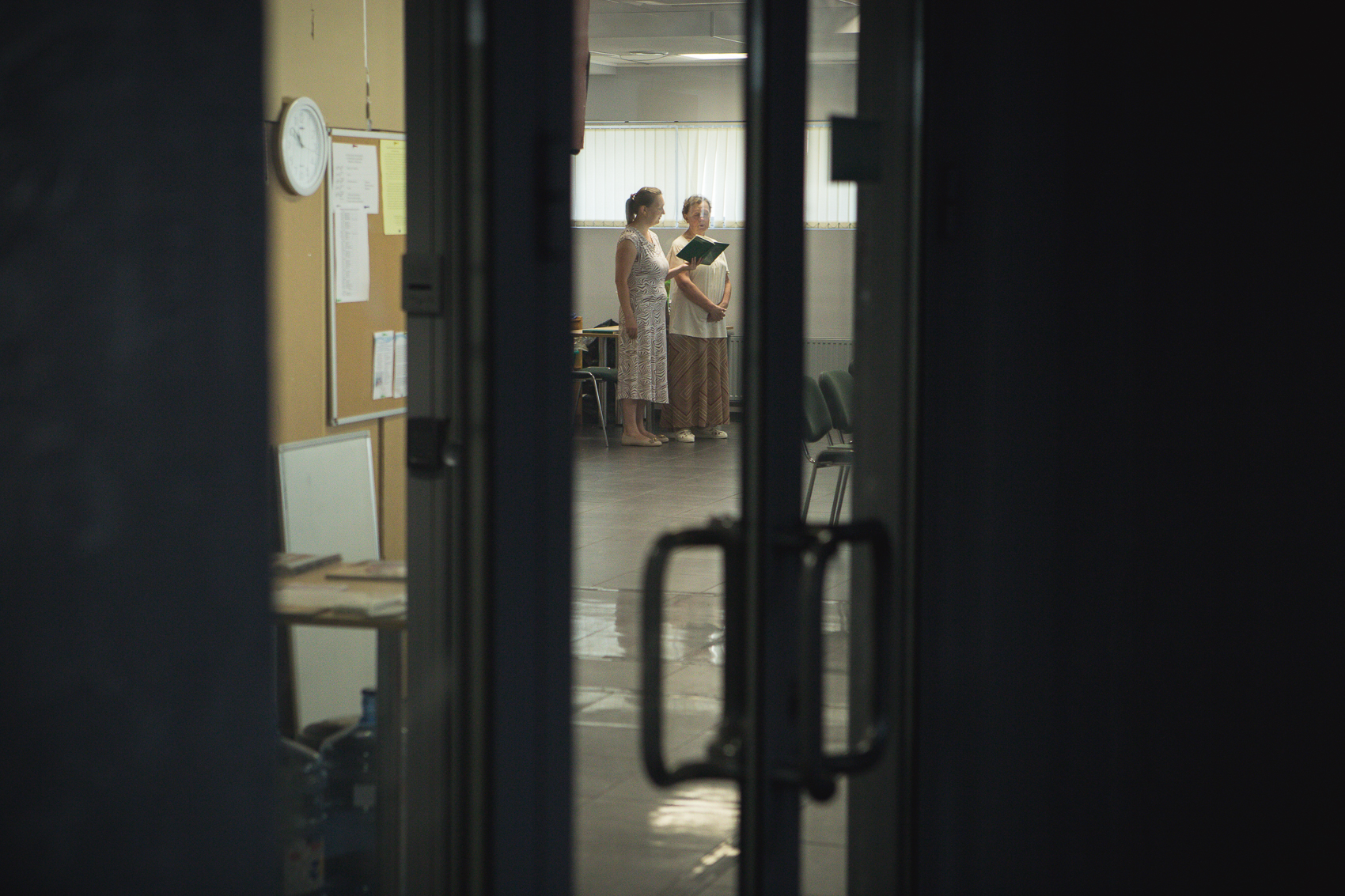 На імправізаваную сцэну каля «прэзыдыюму», за якім сядзяць гэтыя мужчыны, выходзіць дзяўчына, дырыжыруе адной рукой і голасна сьпявае. Вернікі падпяваюць. Большасьць глядзіць у зборнік гімнаў, уголас сьпяваюць ня ўсе. Галасы зьліваюцца ў адзін, пераважна жаночы. З мужчын чуваць толькі брата Алега, які сядзіць за намі зь Лізаветай. Ён сьпявае гучна й разьняволена — як і большасьць жанчын.