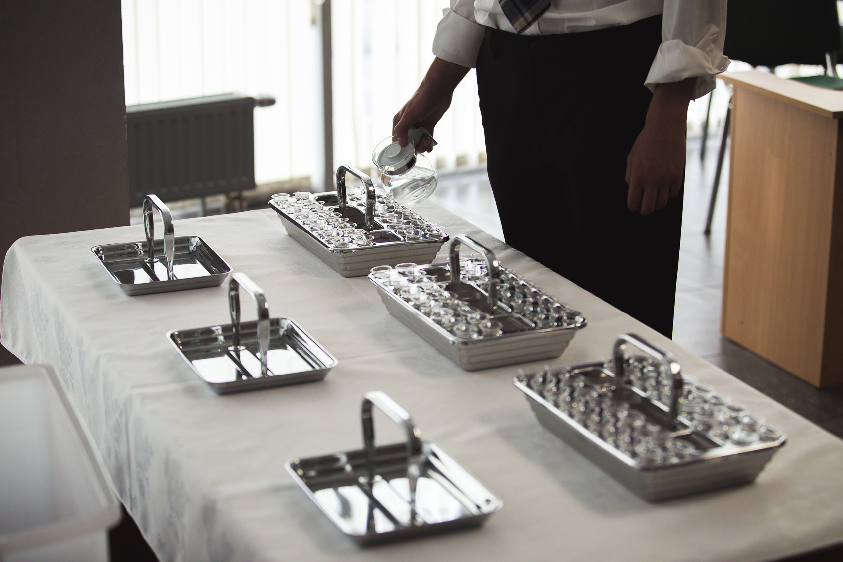 Стол з падносамі для прычасьця, якія разносяць па залі, каб вернікі па чарзе бралі хлеб і ваду